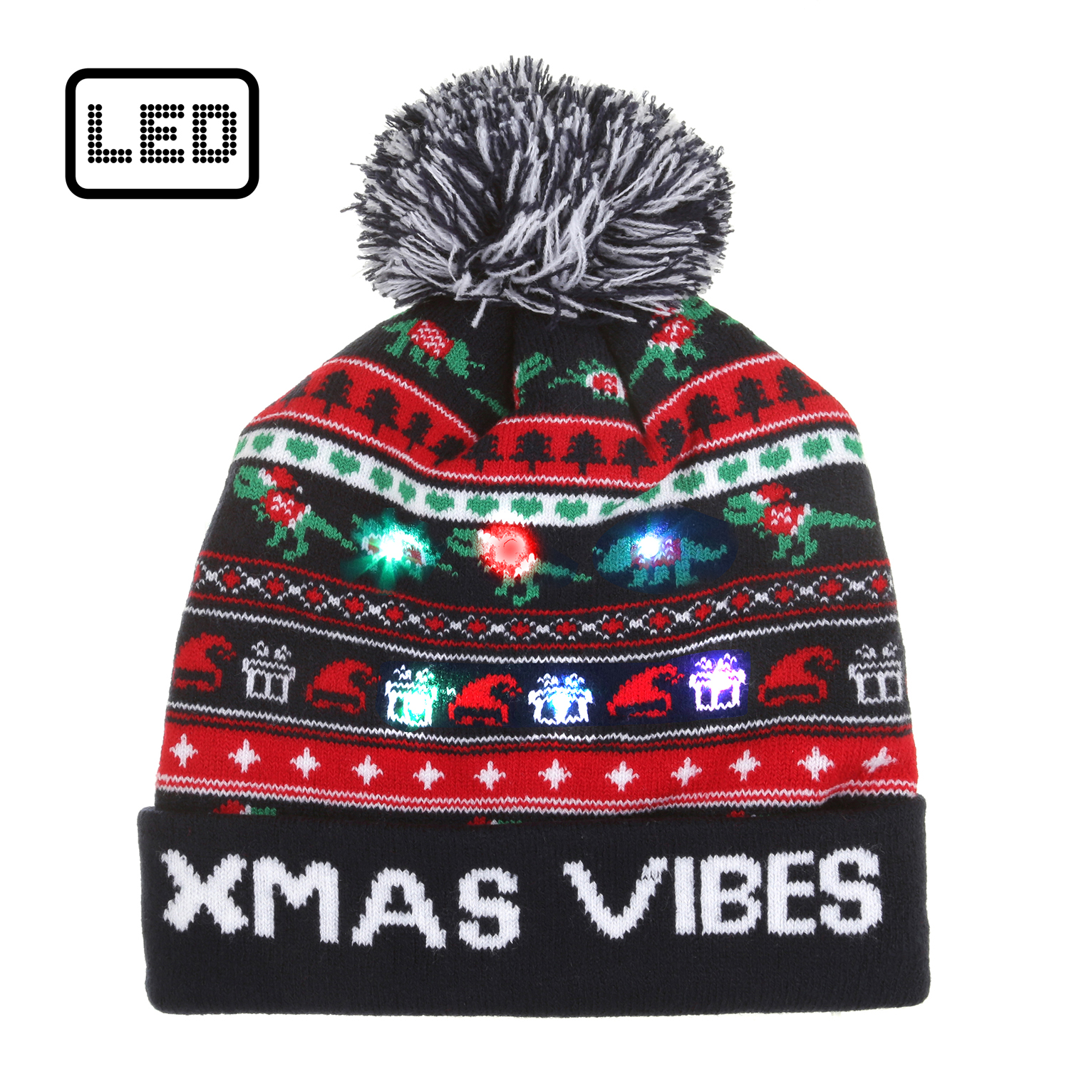 Caldo cappellino con pon pon lavorato a maglia e decorato con dinosauri, cappellini natilizi e pacchetti. Super morbido e confortevole, è in grado di mantenere la testa protetta dal gelo delle giornate più fredde. Ideale anche da regalare a parenti o amici, è dotato di un sistema di luci LED accensibile tramite un interruttore contenuto in una tasca integrata che aggiunge ancora più spirito natalizio. Per preservare le componenti elettriche, si consiglia di pulire semplicemente con un panno umido.
