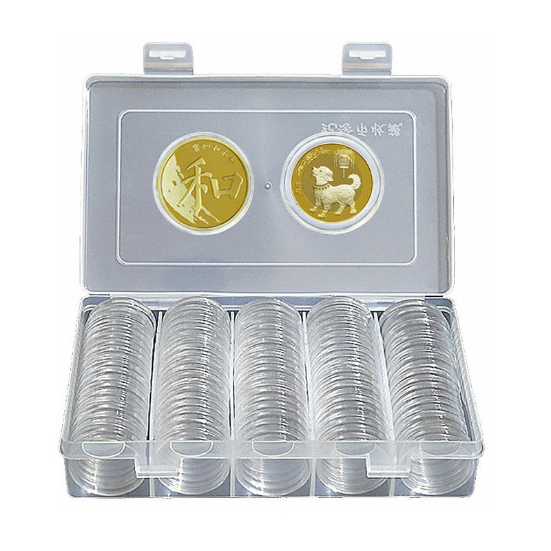 29 mm x 5 mm/1,14 x 0,20 (diametro esterno x altezza) Quantità: 1 set (1 scatola intera, 100 capsule per monete rotonde) Il pacchetto include: (senza pacchetto di vendita al dettaglio) 1 set x organizer per monete (le monete non sono incluse.)