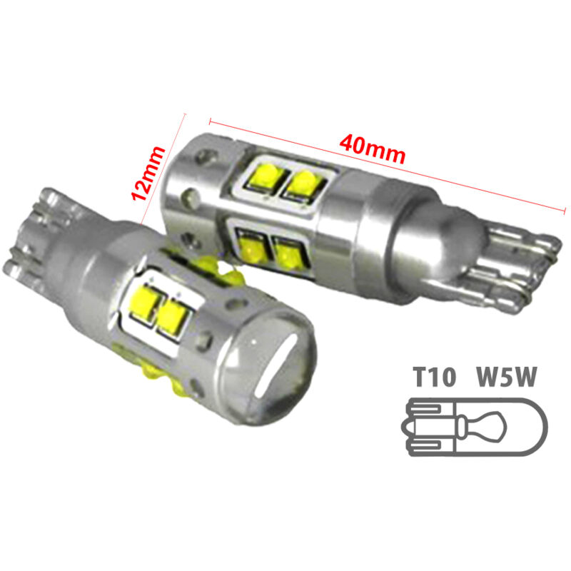Una coppia 2 Pezzi di Lampada Led Attacco T15 W16W e T10 W5W 12V 50W con 10 Smd Cree Da 5W Illuminazione 360 Gradi Super Luminoso Colore Bianco Freddo 6000K Senza Polarità Marca CARALL Codice Prodotto LS1590 Attacco T15 W16W e T10 W5W Voltaggio DC12V Potenza Nominale 50W (10 Led Cree Da 5W) Potenza Effettiva 2W (Si Assorbi 0.17A a DC12V) Luminosità Circa 300 LUMEN Colore Bianco Freddo Circa 6000K Polarità Senza Polarità Canbus NO Dimensione Lunghezza totale 40mm,Diametro in testa 12mm,Lunghezza bulbo 23mm Confezione 2 Lampadine Nota Bene Attacco T15 e T10 in pratica sono gli stessi attacchi,cambiano solo la potenza Queste lampade T10 sono molto luminosi,perciò adatto anche per T15