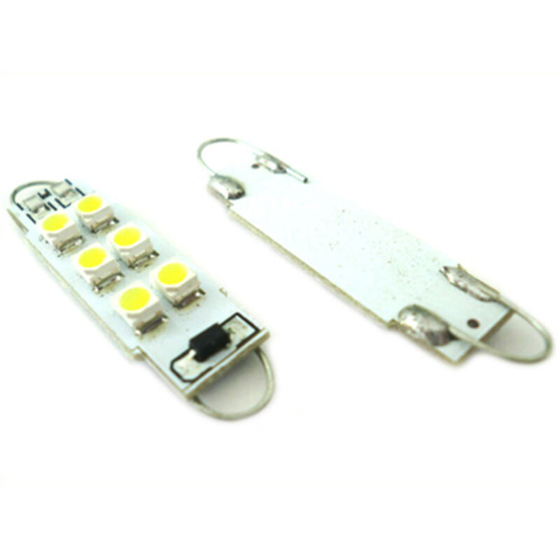 Lampadina Siluro Led 12V T11 Particolare Con Gancio 38mm 6 smd 3528 "1 Coppia" Lampadine Led Siluro T11Particolare Con Gancio -38mm lunghezza 6 Smd 3528- - colorazione Bianco Ghiaccio - -regolabile da 36mm a 41mm modificando dal gancio- INFORMAZIONI UTILI: - Voltaggio 12V - Attacco di tipo:Siluro T11 38mm - Colore luce LED: Bianco Ghiaccio 6000K - Numero di LED SMD per lampadina: 6 Smd 3528 - Potenza di consumo: circa 1W - Dimensioni: Lunghezza totale: 38mm;