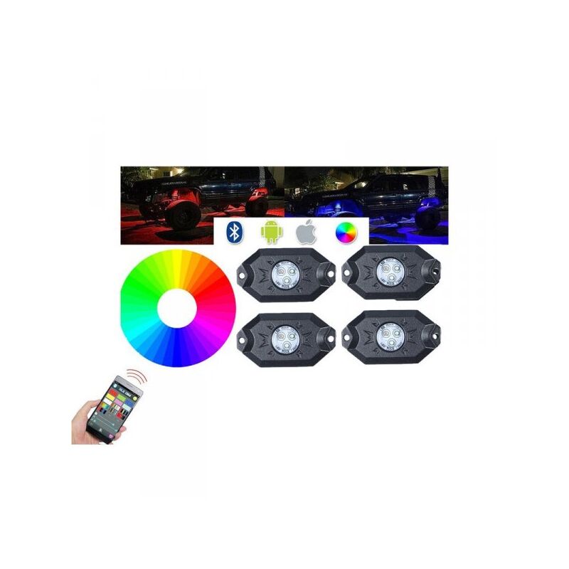 Kit Completo di Mini RGB Rock Light Con 4 Blocchetti di Luci Led (Ogni Luce Ha 3 Cree X 3W) funzione a 12V e 24V Controllabile Tramite Smartphone Con Bluetooth e Compatibile con iPhone e Android, APP RGB Remote,Sensore Musica Tutti i Colori in Una Lampada,Con le Funzioni di Lampeggiante,Regolare La Luminosità,Cambia Colore Con Ritmo Musicale ecc. Ogni Lampada Ha Filo di Allungamento Da 3,5 Metri,Angolo Luce Larga Da 150 Gradi Impermeabile IP68 Antiscivolo Antipolvere Antiruggine Ideale Per Sottoscocca di Auto Camion Jeep SUV Veicoli Pesanti e Barche Marca CARALL Codice Prodotto LN0444 Voltaggio 12V e 24V Potenza Ogni Lampada 9W (3WX3) Numero Lampada 4 Colore RGB APP RGB Remote Compatibile Android e iOS Funzione Bluetooth Dimensione Filo lunga 3,5 Metri Lampada 72X40X12mm Centralina 115X90X25mm Sensore Musica Si Impermeabilita IP68 Vita > 30000 Ore Temperatura di Lavoro -10°C - +60°C Accessori Si