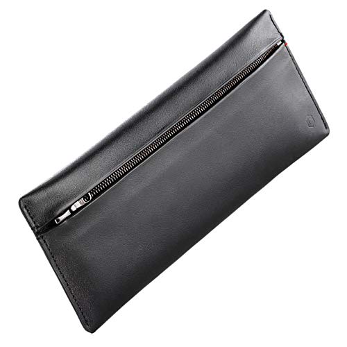 La custodia compatta in pelle nera ha una chiusura lampo nascosta