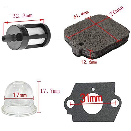Il carburatore BG55 sostituisce C1Q-S68, C1Q-S68G, C1Q-S68D, C1Q-S68E, C1Q-S64.BG55 Il kit carburatore viene fornito il kit di manutenzione Tune Up, incluso filtro 'aria BG85, filtro carburante BG85, tubo flessibile carburante e guarnizioni, Lampadine per primer, (come mostra la foto). Buon rapporto qualità-prezzo.