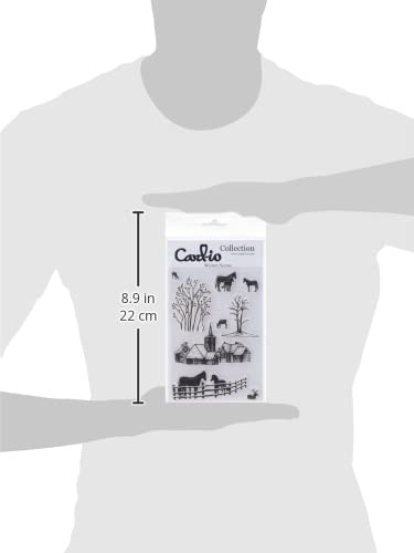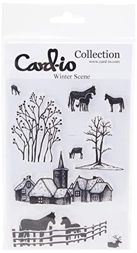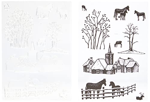 Set di timbri trasparenti con scena invernale, formato A6, con cavalli, cervi e villaggio innevato