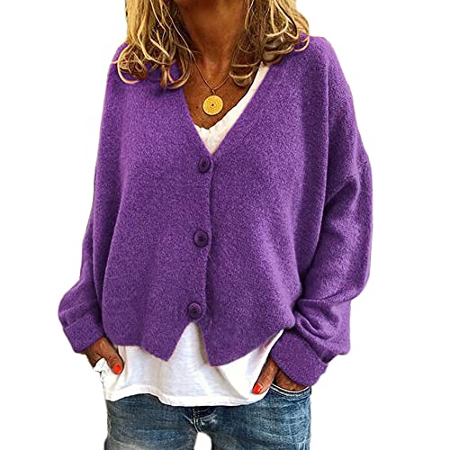 Cardigan da Donna con Scollo A V A Maniche Lunghe, Cardigan da Donna con Bottone, Cardigan in Maglia Tinta Unita Felpa Casual Elegante Moda Outwear,Viola,XXL