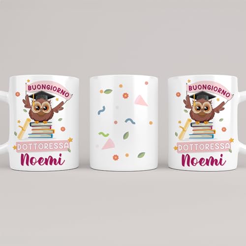 Caribu design Tazza Personalizzata Laurea Donna Buongiorno Dottoressa con Nome - Idea Regalo per Neolaureati/Festa/Tesi Personalizzabile - Mug Gufo con Tocco e Frase