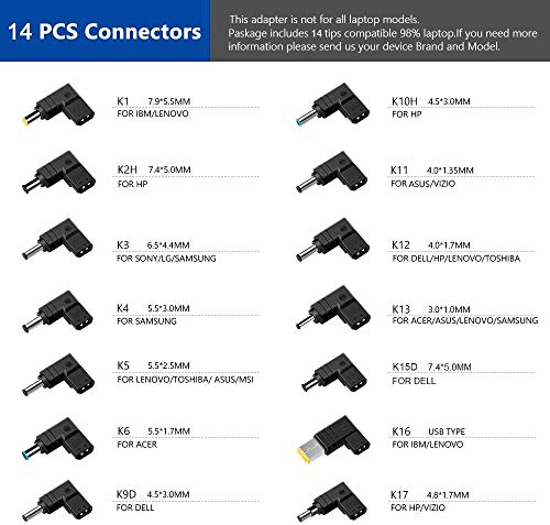 Cavo di conversione dedicato con 14 connettori: K1 - 7,9 x 5,5 mm per Lenovo / K2H - 7,4 x 5,0 mm per HP / K3 - 6,5 x 4,4 mm per Sony LG Samsung / K4 - 5,5 x 3. 0mm per Samsung / K5-- 5.5x2.5mm per Lenovo Toshiba Asus MSI / K6-- 5.5x1.7mm per Acer / K9D -- 4.5x3.0mm per Dell / K10H -- 4.5x3.0mm per HP / K11-- 4.0x1.35mm per Asus / K12-- 4.0x1.7 mm per Dell HP Lenovo / K13-- 3.0x1.0mm per Acer Asus Samsung / K15D -- 7.4x5.0mm per Dell / K16 --USB TYPE Lenovo / K17-- 4.8x1.7mm per HP VIZIO