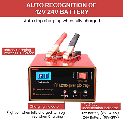 ✅ 【DISTIGAZIONE AUTOMATICA】: tra 12 V/24 V e carica tutti i tipi di batterie al litio (auto o moto). Una volta che la modalità intelligente del caricabatterie è completamente caricata, la corrente si regola automaticamente alla carica minima di microcorrente, il che non influisce sulla batteria.