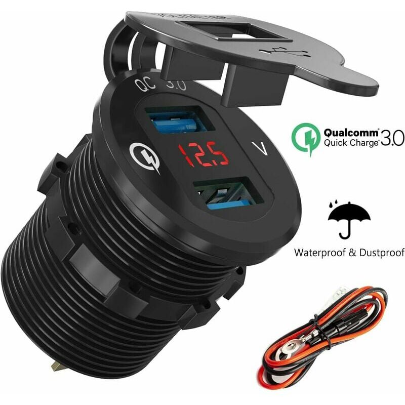 Progettato con due porte USB che supportano QC 3.0, la cui uscita singola massima è di 18 W. Chip Qualcomm ufficiale integrato, rileva in modo intelligente i tuoi dispositivi e carica contemporaneamente 2 dispositivi alla corrente ottimale. Carica i dispositivi compatibili fino a 4 volte più velocemente rispetto alla ricarica convenzionale.Questo caricabatterie per auto si basa sul monitor digitale della tensione a LED, visualizza lo stato della tensione in tempo reale della batteria del tuo veicolo per prevenire problemi causati dalla bassa tensione, la luce rossa lo rende veloce e facile da trovare porte USB al buio o di notte, e il display rosso è visibile come in una forte luce solare Realizzato in lega di alluminio resistente al calore e resistente all'usura. Certificato da CE e ROHS con sovraccarico, lo Smart IC integrato garantisce sovracorrente e cortocircuito per garantire la sicurezza della ricarica, nel frattempo il circuito non verrà bruciato in caso di cablaggio errato.