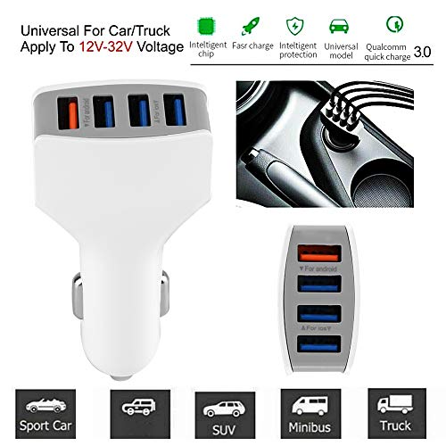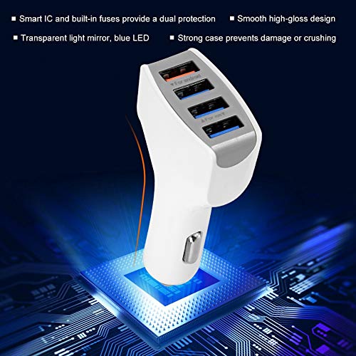 Caricabatteria per Auto USB a 4 Porte, Led Blu con Caricatore Rapido Smart IC ABS per Telefoni Cellulari, MP3, Fotocamera, GPS, Auricolare Bluetooth(White)