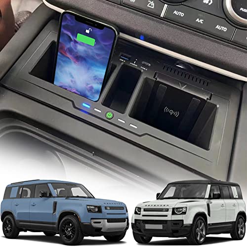 [PER L'ACCESSORIO DI RICARICA WIRELESS PERFETTO DEL DEFENDER] - Il nuovo caricabatterie wireless per auto di aggiornamento è il nuovissimo design personalizzato per Defender 90 110 130 2020 2021 2022 2023 Tutti i modelli. puoi sfruttare la funzione di ricarica wireless nella tua auto poiché è un accessorio di aggiornamento indispensabile per i tuoi interni. Si adatta perfettamente alla console centrale originale dell'auto di tutti i Defender 90/110/130 (2020-2023).