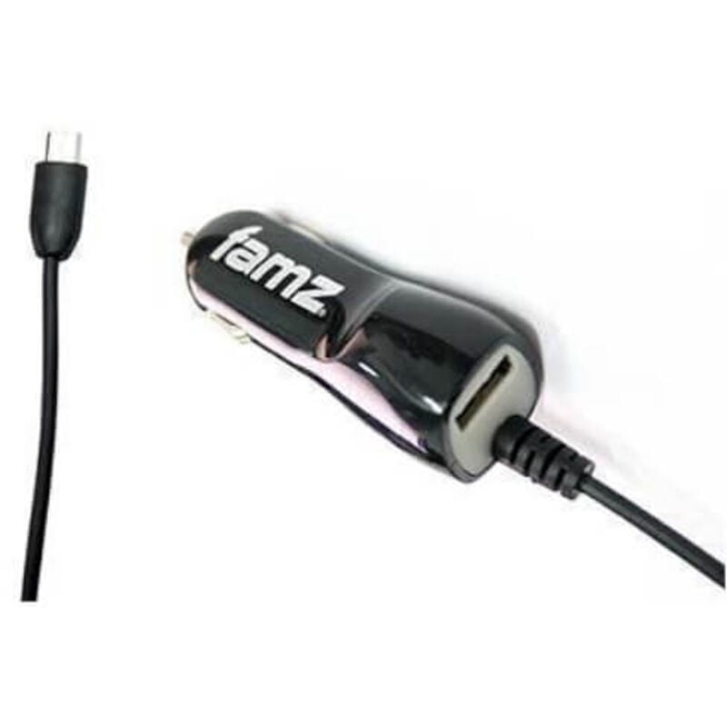 Caricatore de auto micro-USB 1200 mAh Carica il tuo cellulare de rapidamente e comodamente durante la guida, con questo caricabatterie de il brand Famz, con un ingresso micro USB + unaa ingresso de USB, de 1200 mAhde batteria. Questo caricabatterie nero de è perfetto per aggiungere il punto de batteria che manca per arrivare a casa.