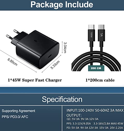 45W USB C Caricabatterie Compatibile con Samsung S22+, S22 Ultra, S21 Puls, S21 Ultra, S20 Puls, S20 FE, Galaxy Tab S8, S8+, S8 Ultra, S7, PPS Caricatore Originale 45W con Cavo Type C 200cm - Nero