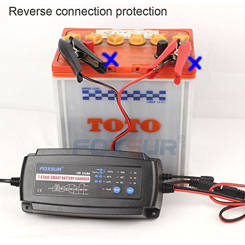 Caricabatterie intelligente FOXSUR 12V 2A 4A 8A 7 fasi, GEL WET AGM Tipo di batteria e corrente di carica selezionabile, Caricabatterie per auto, Caricabatterie per moto