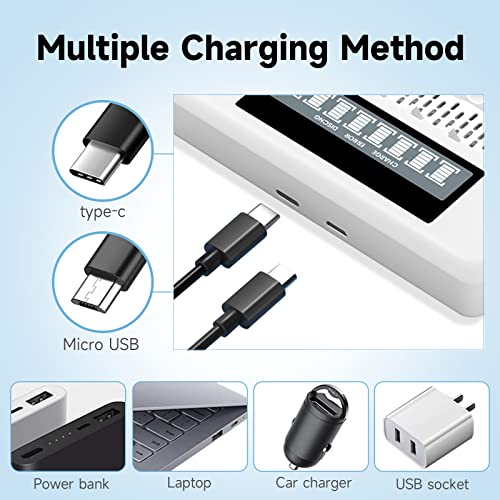 【Slot di ricarica individuali】Il caricabatterie unibersal usb c ha 8 slot individuali per la ricarica di qualsiasi numero di batterie ricaricabili AA/AAA al litio, prolungando la vita delle batterie con la carica di mantenimento.Il caricabatterie solare per piccole tutte le batterie ha una funzione di controllo del chip che interrompe automaticamente la carica quando la batteria è completamente carica.