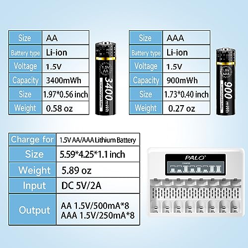 Caricabatterie con Pile - 4 AA da 3400 mWh e 4 AAA Pile da 1,5 V da 900 mWh con Caricatore Rapido Individuale LCD, per Batterie al Litio AA AAA Ricaricabili