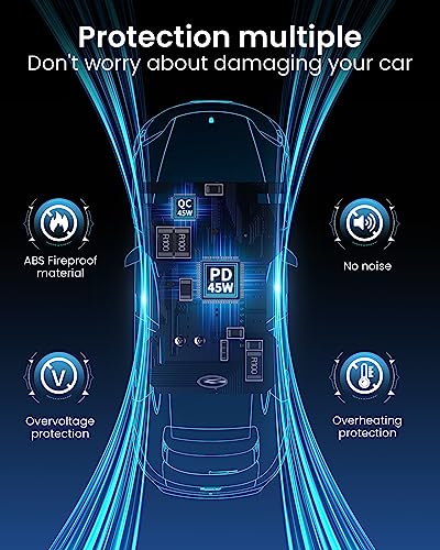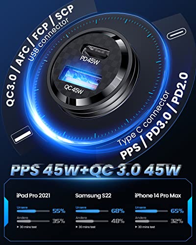 【PD45W+QC45W carica rapida】 Questo caricabatterie auto supporta l'alta potenza PD 45W (Tipo C) e QC 45W (USB), può caricare rapidamente la maggior parte dei telefoni/iPad/Tablet allo stesso tempo. La porta USB C (PPS 45W) supporta Samsung Super Fast Charge 2.0 per caricare Samsung S23/22/21 ultra da 0% a 68% in 30 minuti. La porta USB-A può caricare la maggior parte dei dispositivi Android dallo 0% all'88% in 30 minuti.