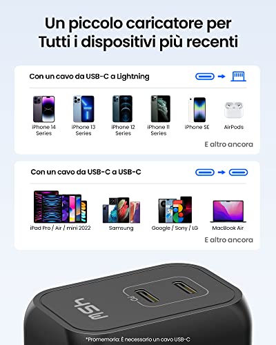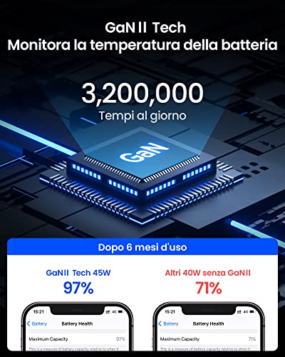 ✅【GaN 45W Velocizza La Ricarica】 GaN 45W soddisfa con successo anche il fabbisogno energetico massimo dei dispositivi più recenti, alimenta iPhone 14 fino all'89% o Samsung S22 Ultra fino al 92% in soli 30 minuti, ed alimenta MacBook Air al 71% con 1 ora carica, ma altri 20 W ottengono solo il 37%.