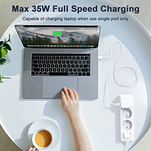 【Caricatore iPhone Alta Velocità】Il caricabatterie rapido iPhone collega un singolo dispositivo a ottenere carica massima 35W che sufficiente alimentare laptop a piena velocità. Tecnologia PD 3.0 alimentatore iPhone carica iPhone dallo 0% al 65% in 30 minuti, carica Pad dallo 0% al 55% in 30 minuti. Il caricabatterie iPhone è 5X più veloce caricabatterie originale 5W, e 1,5X più veloce caricabatterie 20W (Nota: Quando due porte di caricatore iPhone sono caric stesso tempo, condivideranno 35W).
