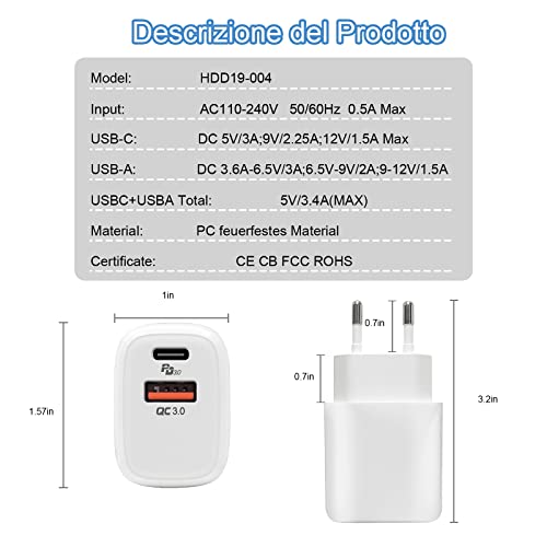 【Contenuto della confezione】 Spina USB C a doppia porta da 20 W * 1, Manuale * 1 (cavo non incluso);