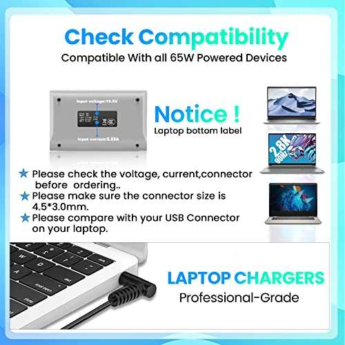 Pacchetto e servizio post-vendita perfetto: 1 x adattatore CA HP da 65 W, 1 x cavo di alimentazione CA. Adattatore di alimentazione con servizio gratuito di 12 mesi, garanzia di rimborso di 60 giorni e supporto e-mail 24 ore su 24 tutti i giorni.