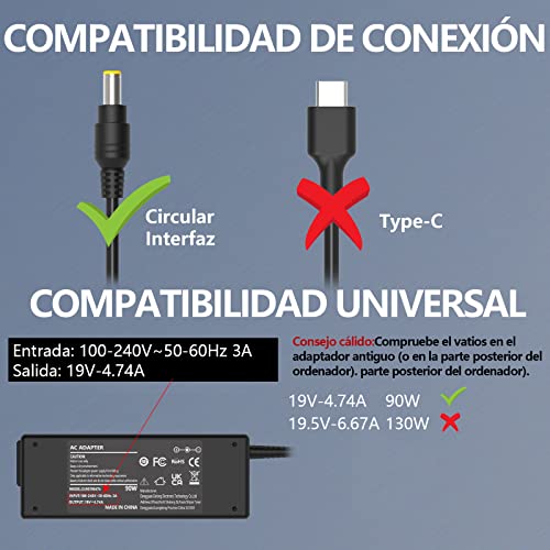 90W Caricatore Portatile Compatibile per Acer Aspire Adattatore Nitro 5 AN515-42 AN515-51 Acer Extensa 2519 2520 2520G 2530 2540 2600 Aspire 8930G 5935G Caricabatterie per PC Alimentazione Cavo