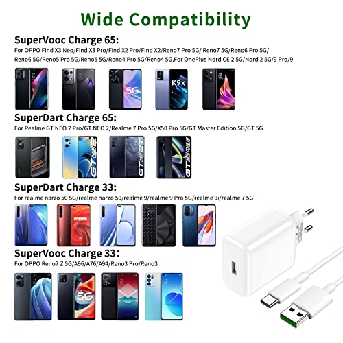 65W Caricatore Rapido con Cavo USB C 1M per OPPO Find X5 Pro X5 Lite,SUPERVOOC Charge Caricabatterie Spina Alimentatore per OPPO Reno 8 Pro 8 7 Pro 7 6 Pro 6 A16 A96 A94 OnePlus Nord CE 2 11 9 Pro