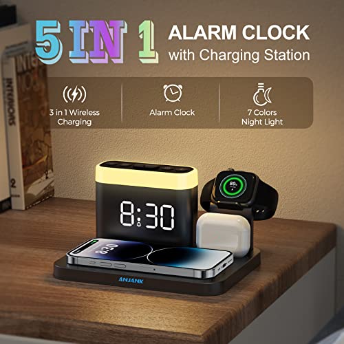 【Stazione di ricarica wireless 5 in 1】 Fornisce stazioni di ricarica multiple per il telefono/Apple Watch/Apple Airpods ed è dotato di sveglia digitale, funzione di luce notturna a 7 colori. Dite addio ai cavi disordinati e risparmiate spazio sul vostro comodino.