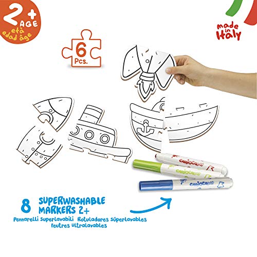 Carioca Coloring Puzzle Transports, Puzzle da Colorare per Bambini, Kit da 2 Puzzle da 3 Pezzi, Fantasia Trasporti, con 8 Pennarelli con Punta Fine Super Lavabili, Tessere Colorabili