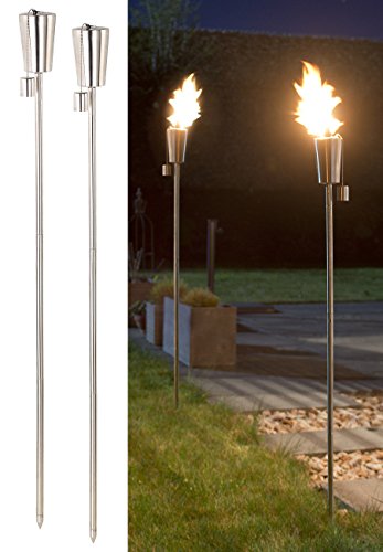 Set di 2 torce da giardino in acciaio inossidabile:ideale per giardino, Terrazzo e balcone • Blocco di sicurezza: previene la fuoriuscita di olio per lampade • Tempo di combustione: a seconda dell'olio della lampada fino a 5 ore • Dimensioni con picchetto (H x Ø): 110 x 7,5 cm, Peso: 300 grammi