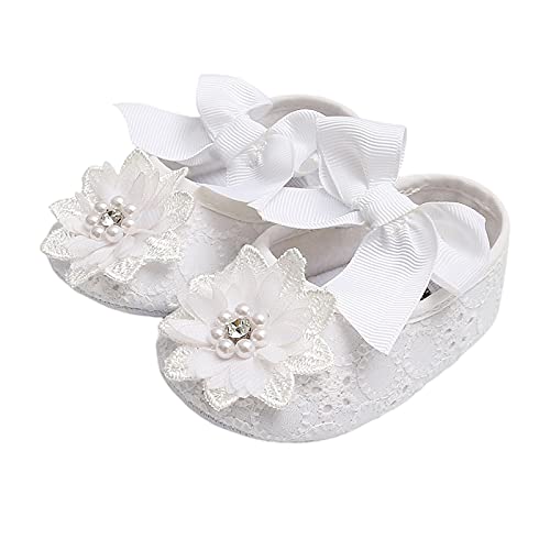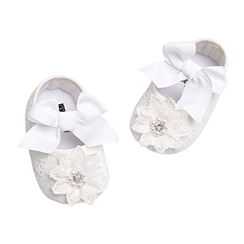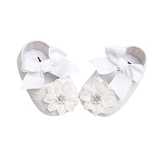 Carolilly 2 Pz Set Scarpe Primi Passi Bowknot Battesimo da Neonata Infantile Scarpine Neonato Principessa Antiscivolo con Fiore +Fascia Neonata (Bianco, 0-6 Mesi)