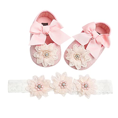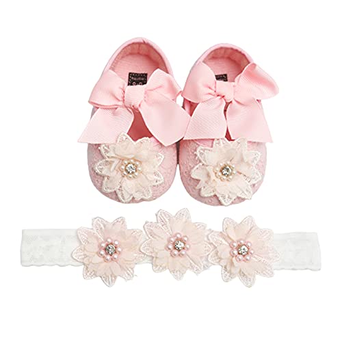 Carolilly 2 Pz Set Scarpe Primi Passi Bowknot Battesimo da Neonata Infantile Scarpine Neonato Principessa Antiscivolo con Fiore +Fascia Neonata (Rosa(con Fascia), 0-6 Mesi)