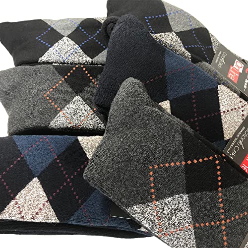 Calze lunghe uomo in morbido e pesante cotone caldo, morbidissime e calde, confortevoli, con grande isolamento termico e ottima vestibilità. Confezione da 6 paia assortita nei colori moda a rombi come foto. Composizione: 80%cotone, 17%poliestere, 3%elastan