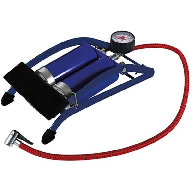 Questa pompa a pedale a doppia canna della Carpoint � perfettamente adatta per applicazioni che richiedono un volume d'aria elevato o un gonfiaggio rapido. La pompa � caratterizzata da un robusto design interamente in metallo con un doppio fusto. Ha un manometro integrato con doppia tacca di pressione da 0 a 100 psi e da 0 a 7 bar. Il pedale presenta un design antiscivolo per evitare scivolamenti durante il pompaggio. Colore: Blu Materiale: Metallo Dimensioni: 9 x 29 x 15 cm (L x P x A) Doppia canna: 2 x 12 cm (L x P) Manometro 90� Con manometro e adattatori Manometro 270� Il quadrante di pressione segna 0-100 psi e 0-7 bar Pedale antiscivolo