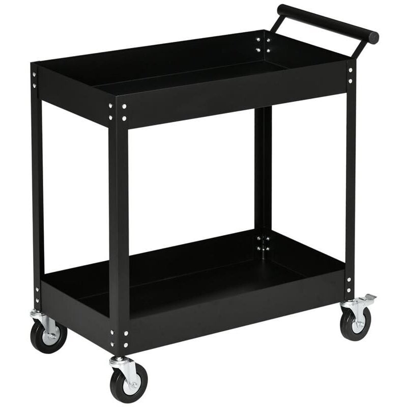 Questo carrello per officina è il tuo assistente di lavoro perfetto. I due ripiani ti offrono tanto spazio per posizionare i tuoi attrezzi. e la maniglia e le ruote ti permettono di spostarlo agilmente ovunque ti serve. La struttura in acciaio assicura una robustezza ottimale. rendendo questo carrello porta utensili ideale per assisterti nelle tue attività in garage. officina. ecc. Carrello da officina Colore: Nero Materiale: acciaio laminato a freddo Dimensioni generali: 84.5 x 38 x 84 cm Dimensioni ripiano superiore: 74.5 x 38.5 x 9 cm Dimensioni ripiano inferiore: 74 x 38 x 9 cm Distanza tra i ripiani: 57.3cm Capacità di peso totale: 150kg Portata massima di ogni ripiano: 75kg