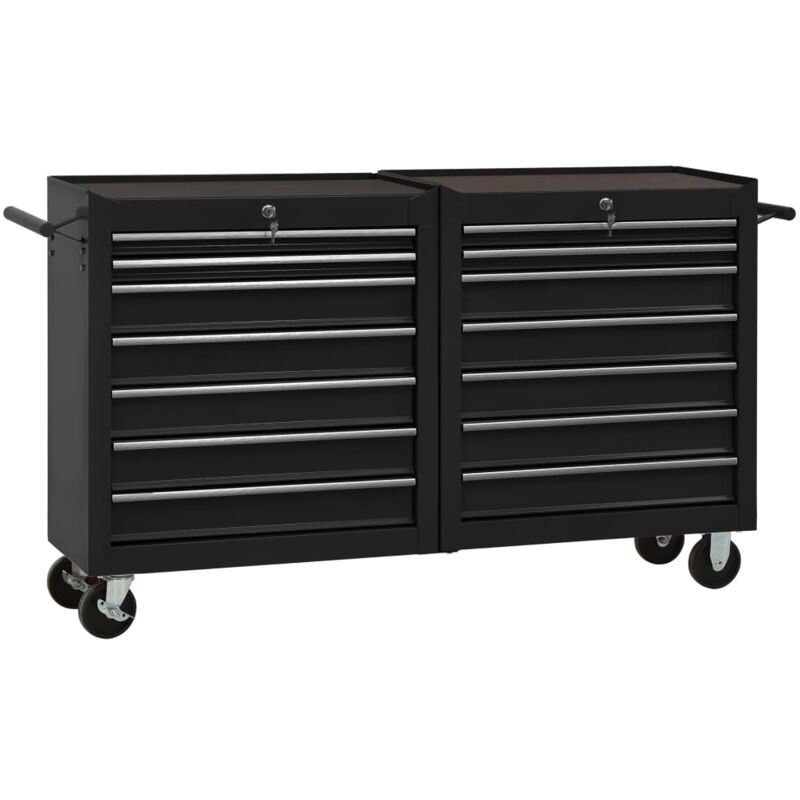 Utilizzate questo carrello portautensili spazioso e flessibile con 14 cassetti scorrevoli per riporre e tenere in ordine i vostri attrezzi. Realizzato in acciaio robusto, il carrello portautensili da officina ha una struttura robusta e durevole. Grazie alle serrature integrate, i cassetti possono essere bloccati subito per evitare che si aprano accidentalmente durante lo spostamento del carrello. Ogni cassetto ha un rivestimento inferiore antiscivolo per mantenere i vostri strumenti in posizione. Il robusto piano di lavoro sulla cassetta degli attrezzi è un ottimo punto per tenere a portata di mano gli strumenti utilizzati di frequente. Con 4 ruote piroettanti, 2 delle quali dotate di freno, il carrello può essere spostato facilmente. Sono presenti due comode maniglie laterali per spingere il carrello. La consegna include anche chiavi e accessori di montaggio. Colore: Nero Materiale: Acciaio Dimensioni complessive (con ruote): 140 x 33 x 77,2 cm (L x P x A) Dimensioni cassetto grande