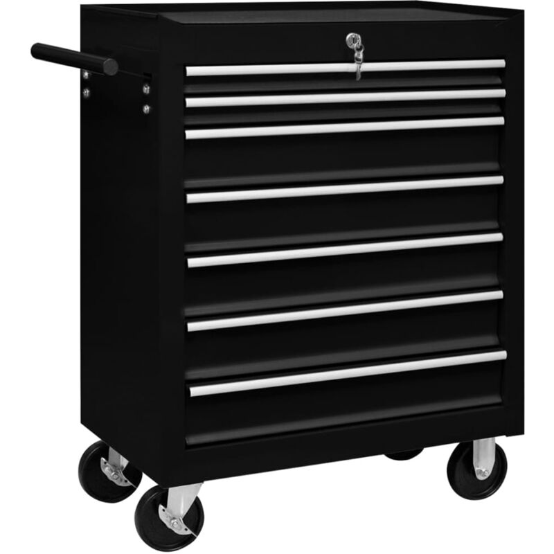 Usa questo carrello comodo con 7 cassetti scorrevoli per depositare e mantenere in ordine i vostri strumenti. Ciascuno dei cassetti ha un rivestimento antiscivolo sul fondo, quindi gli strumenti non scivolano. Grazie al sistema di chiusura integrato, tutti i cassetti possono essere chiusi facilmente, quindi non si apriranno in modo accidentale quando il carrello viene spostato. Due ruote sono dotate di freno. Il piano superiore robusto del carrello sarà perfetto per poter tenere a portata di mano gli attrezzi che usate di più. Il manico laterale per spostare il carrello è molto comodo. Colore: Nero Materiale: Acciaio Dimensioni di ingombro (con ruote): 690 x 330 x 772 mm (L x P x A) Dimensioni del cassetto 1: 510 x 290 x 40 mm (L x P x A) Dimensioni del cassetto 2: 510 x 290 x 85 mm (L x P x A) Con 7 cassetti scorrevoli Bloccabile Superficie antigraffio Costruzione durevole con 4 ruote piroettanti (2 con freno) Assemblaggio richiesto: Sì