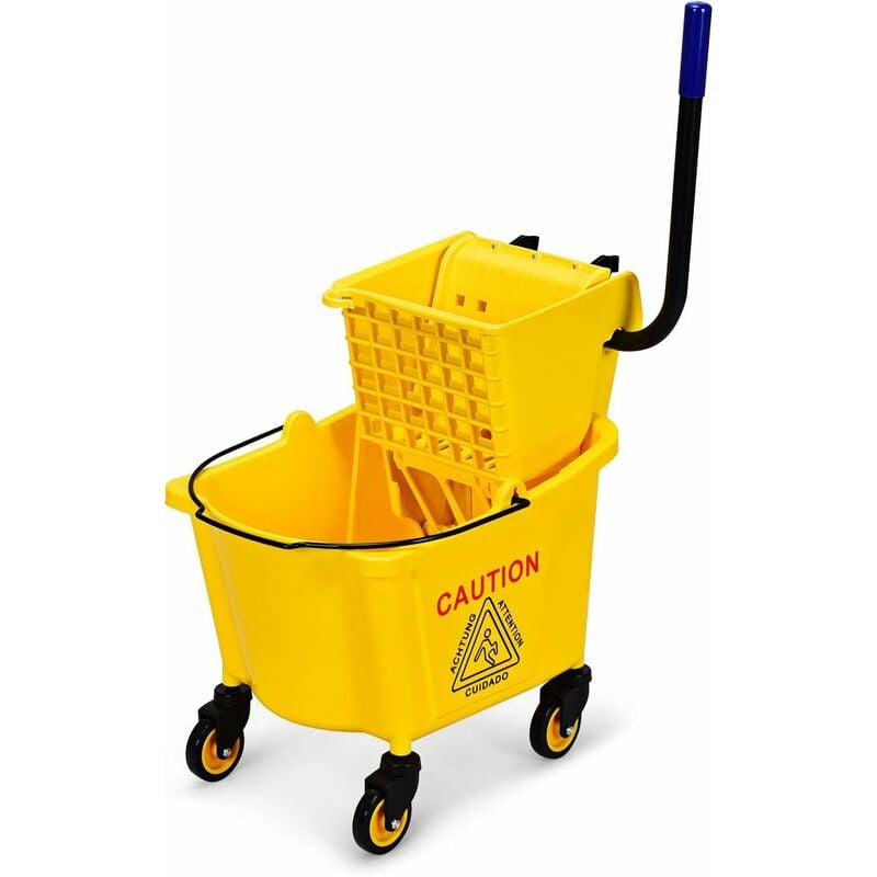 INFORMAZIONI Secchio per Mocio con Grande Capacità: Con una capacità di 24 L, questo secchio per mocio può contenere più acqua in una volta riducendo il numero di aggiunte di acqua. Oltre alla grande capacità, questo secchio è profondo e non troverai perdite di acqua o schizzi quando lavi il mocio. In questo modo, puoi pulire efficacemente e molto meglio. Strizzatoio Laterale ad Alta Efficienza: Sostenuto da una molla, lo strizzatoio resistente evita di farti strizzare a mano il mocio e di farti sporcare. La lunga pressione strizza molto bene tutta l'acqua dal mocio. Inoltre, la parte con lo strizzatoio si può rimuovere per svuotare facilmente l'acqua. Ruote Comode e Antigraffio: Con 4 ruote universali, il secchio per mocio si può spostare facilmente da una parte all'altra senza dover fare sforzi per pulire grandi aree. Le ruote in TPR si adattano a diversi pavimenti senza graffiarli. Ottimo Porta Mocio e Manico: Questo secchio ha un porta mocio che lo mantiene dritto evitando che