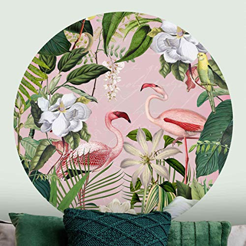 Carta da parati rotonda autoadesiva Tropicale Fenicotteri con piante in rosa 175x175cm