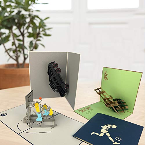 ✔ Set di 4: carte pop-up 3D assortite per bambini, include dinosauro, camion, partita di calcio, partita di basket