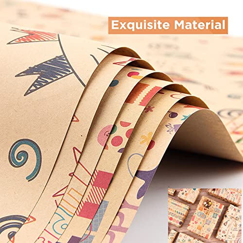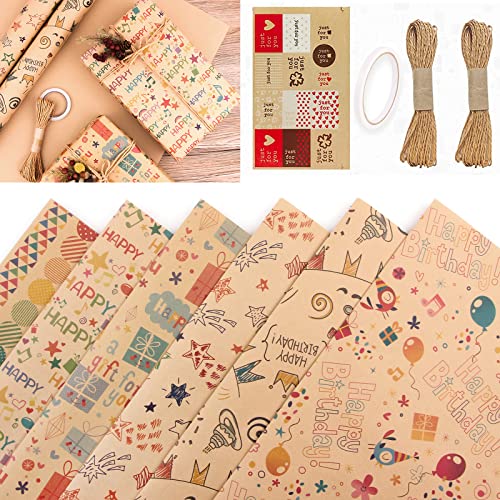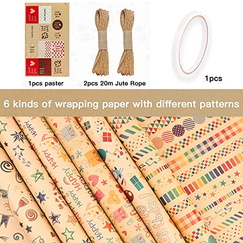 通用 Carta da Regalo Kraft, 6 Fogli Carta da Regalo Natalizia Kraft Carta Regalo Carta Kraft con 20m Corde e Etichette Regalo, Vintage Piegati Carta da Regalo per Compleanno Anniversari San Valentino