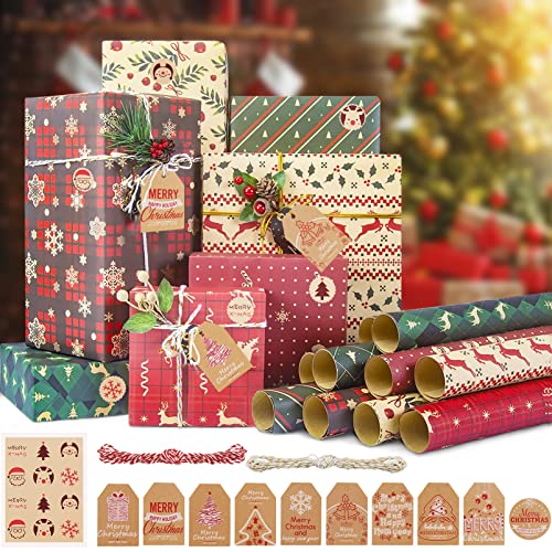 Contenuto del set: include 8 pezzi di carta da regalo natalizia + 10 etichette + 5 m di corda di cotone rossa e bianca + 5 m di corda di cotone gialla e bianca + 1 pezzo di 12 adesivi natalizi. (Promemoria: per facilitare il trasporto, la carta da imballo è piegata, non in rotoli)