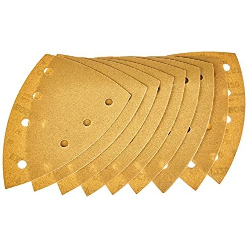 Foglio di macinazione C470. Meglio per legno e vernice. 10 confezione. Foglio di macinazione per il mio delta. 7 fori. Con un doppio sistema. Larghezza: 100 mm. Lunghezza: 150 mm. Grano 120. Foglio potente abrasivo. Per la macinazione in angoli e superfici. Con un sistema di camion per il cambio di foglia rapida e i fori di aspirazione per l'estrazione interna della polvere. Adatto per macinare il legno. Colore. Colore. Spatola. Adatto per tapparelle delta da Bosch. Festool.