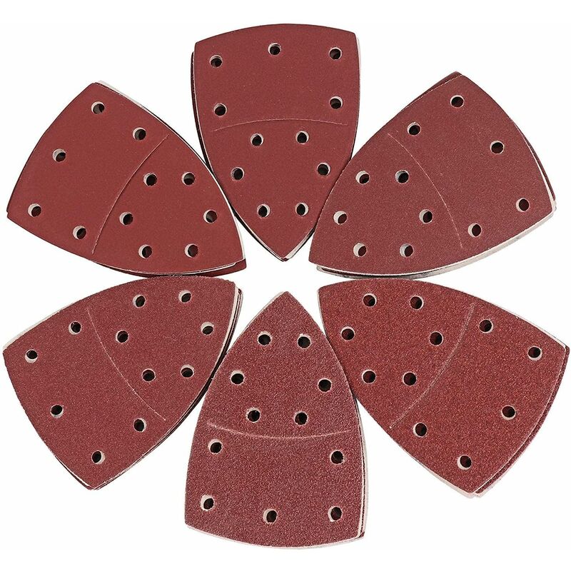 6 diverse grane: ogni tipo contiene 10 fogli di carta vetrata resistente, rispettivamente 40, 60, 80, 120, 180 e 240 per soddisfare le diverse esigenze Alta qualità: realizzata con abrasivo a base di allumina di alta qualità, la carta vetrata è resistente e antistatica, ideale per la levigatura e la lucidatura. Facile da usare: velcro autoadesivo, facile e veloce da attaccare. lunghezza e altezza del lato del triangolo: 150 * 150 * 105 mm, utilizzando la più recente tecnologia di taglio per facilitare la segmentazione. Ampia applicazione: ideale per rimuovere ruggine, lucidare metallo, legno, plastica, pelle, gomma, vetro, ecc.