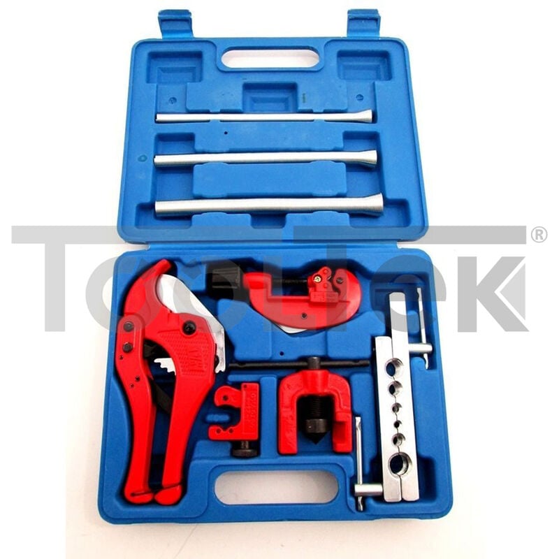 CARTELLATRICE FLANGIATUBO APPARECCHIO PER COLLETTI TAGLIATUBO MINI FORBICE 42mm Set idraulico 9 pezzi in valigetta universale per misure in pollici. CARATTERISTICHE: 1 cesoia per tubi 1 - 5/8, 42mm 1 tagliatubo a rotella 1/8- 1 1/8, 3 - 28mm 1 tagliatubo mini 1/8 - 7/8, 3 - 22mm 1 cartellatrice flangiatubi 6 - 8 - 10 - 12 - 14 - 15 mm 4 piega tubi a molla 3/16 - 1/4 - 3/8 - 1/2 Il tutto contenuto in un box di plastica chiudibile. Prodotto di qualità