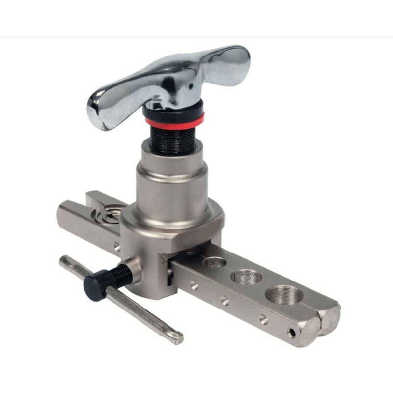 CARTELLATRICE TUBI RAME FLANGIATUBO UTENSILE SVASATORE 90° FRIZIONE 2 DIME 452to Cartellatrice per tubi, a frizione, angolo a 90°, in mm Ideale per l'espansione manuale di tubi e la realizzazione di flange di collegamento coniche a 90° Realizzata in acciaio forgiato di alta qualità Fornita con 2 dime Barra di serraggio e cono eccentrico di flangiatura in acciaio Forcella con perno di centratura e indicatore di posizione Utilizzabile su tubi di mm: 5, 6, 8, 10, 12, 16, 19 Per tubi in acciaio, metalli non ferrosi, alluminio, plastica