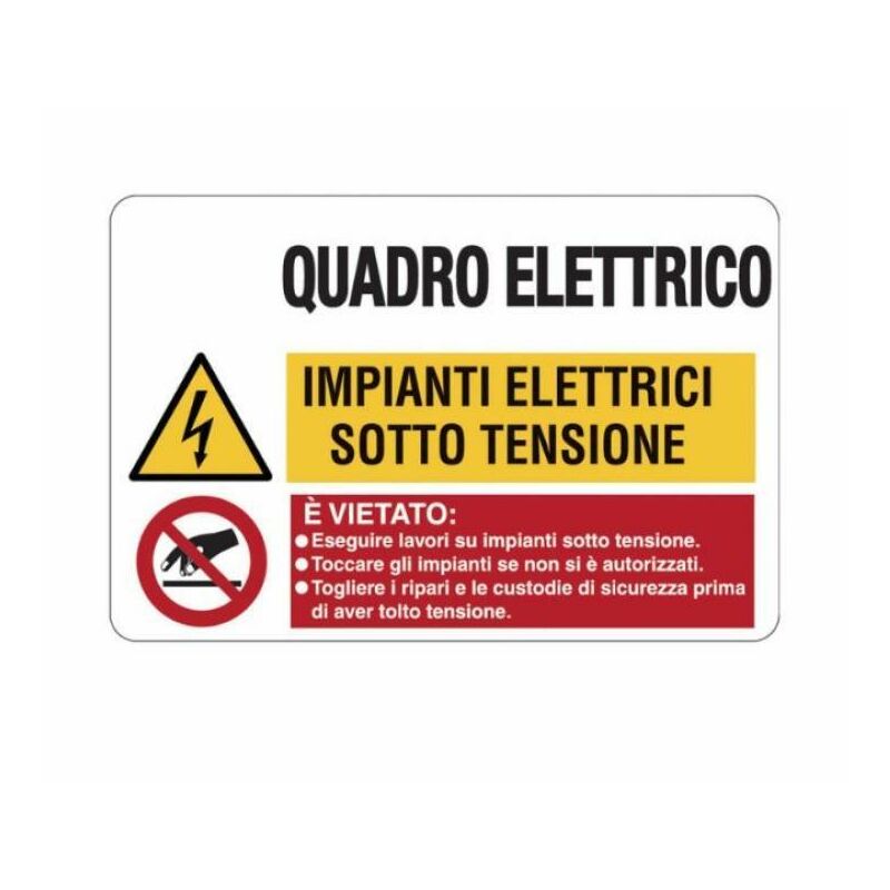 Cartello alluminio Cartelli Segnalatori quadro elettrico - EF3563 Materiale alluminio Larghezza 30 cmAltezza 20 cmMessaggio Quadro Elettrico Impianti elettrici sotto tensione E' vietato:-eseguire lavori su impianti sotto tensione.-Toccare gli impianti se non si è autorizzati.-Togliere i ripari e le custode di sicurezza prima di aver tolto tensione.