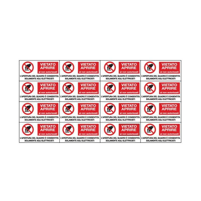 16 Etichette adesive Cartelli segnalatori 'vietato aprite' - 91540-C Materiale adesivo 16 etichette Testo: Vietato aprire ai non autorizzati L'apertura del quadro è consentita solamente agli elettricisti Dimensione singola etichetta 4x8 cm