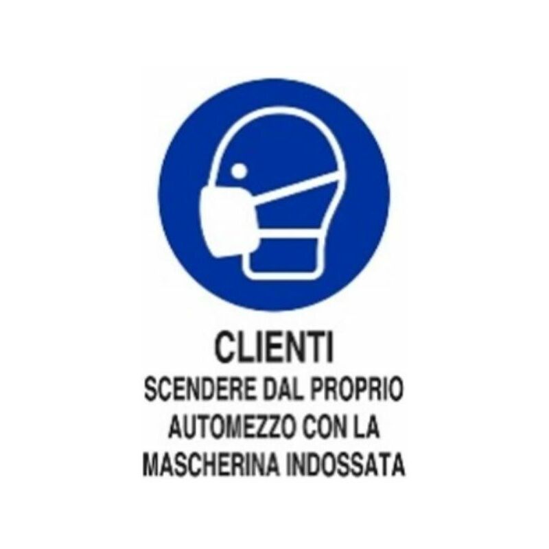 Codice: M0160050ALB0300X0200 Marca: MASCHERINE. Cartello Clienti Scendere Automezzo con Mascherina 30x20cm