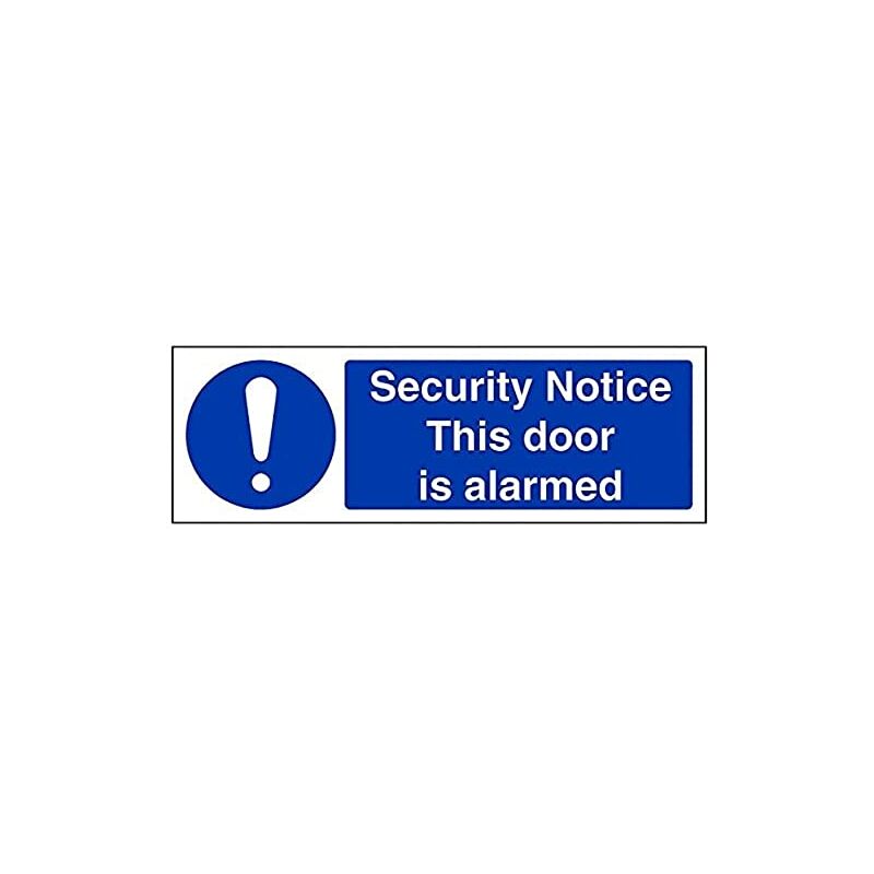 Cartello obbligatorio,Security Notice This Door Is Alarmed, autoadesivo, paesaggio, 300 mm x 100 mm, blu, V Safety 18076AX S
